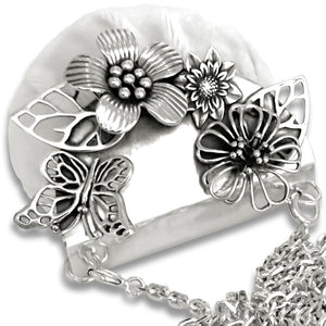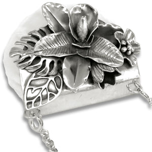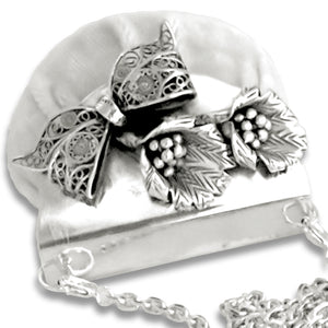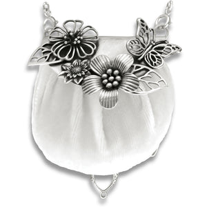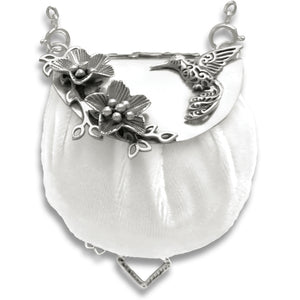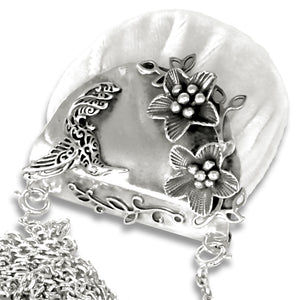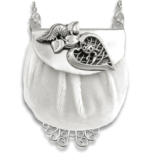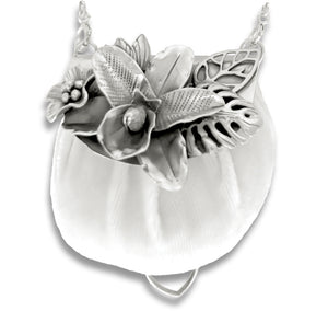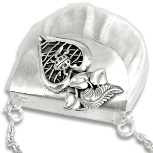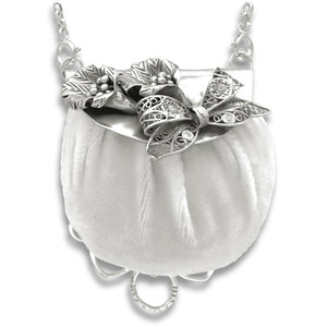 This Pincushion Purse Chatelaine is crafted with sterling silver and requires a double clasp chain. It has a removable silk velvet cushion that is stuffed with felted wool. The loops at the bottom are designed to carry your sewing tools and accessories. Enjoy the convenience of having your essentials on-hand and securely fastened. Each pincushion purse is unique. Contact Jan with your requests and ideas. Extra solid colored silk velvet cushions are $65 each, or the paper pattern is Free. There are multi-colored (tie dyed) cushions available for $75. Many different themes are carried out on the frames from simple to silly to classic. Â